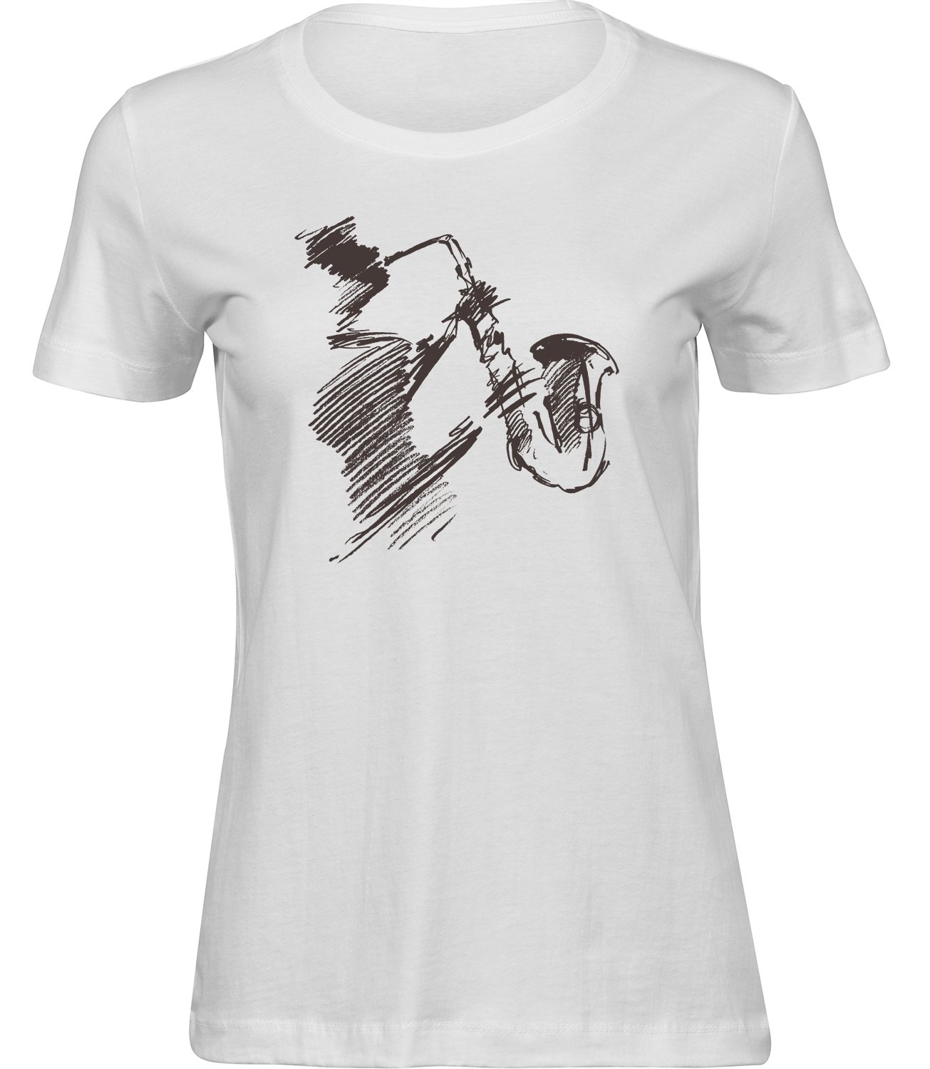 Stylisches Freizeit Frauen T-Shirt “SAXOPHONMUSIK” – aus hochwertigem 100% Baumwolle Stoff.